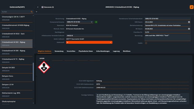 Perfekt, dass damit auch die gesetzliche Anforderung zur Führung eines Gefahrstoffverzeichnisses erfüllt wird. Zudem sind dort alle relevanten Dokumente wie Sicherheitsdatenblätter und Betriebsanweisungen hinterlegt.