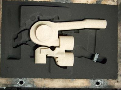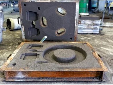 A sand mold consists of two or more sections. Liquid metal is poured into the cavities formed by the mold.